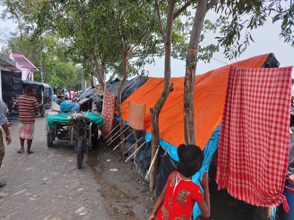 Packets of relief material which included basic foodstuffs like rice, dal, biscuits, chidwa, sattu, muri, aloo (potatoes), pyaaz (onions) and baby food were given to the people along with other items required for daily use like utensils, clothes, soap, sanitary napkins. Tarpaulin was also given to the people to provide some protection from rain in the tents that they had set up along the bank of the river, as their actual homes had been flooded in and destroyed by the cyclone.