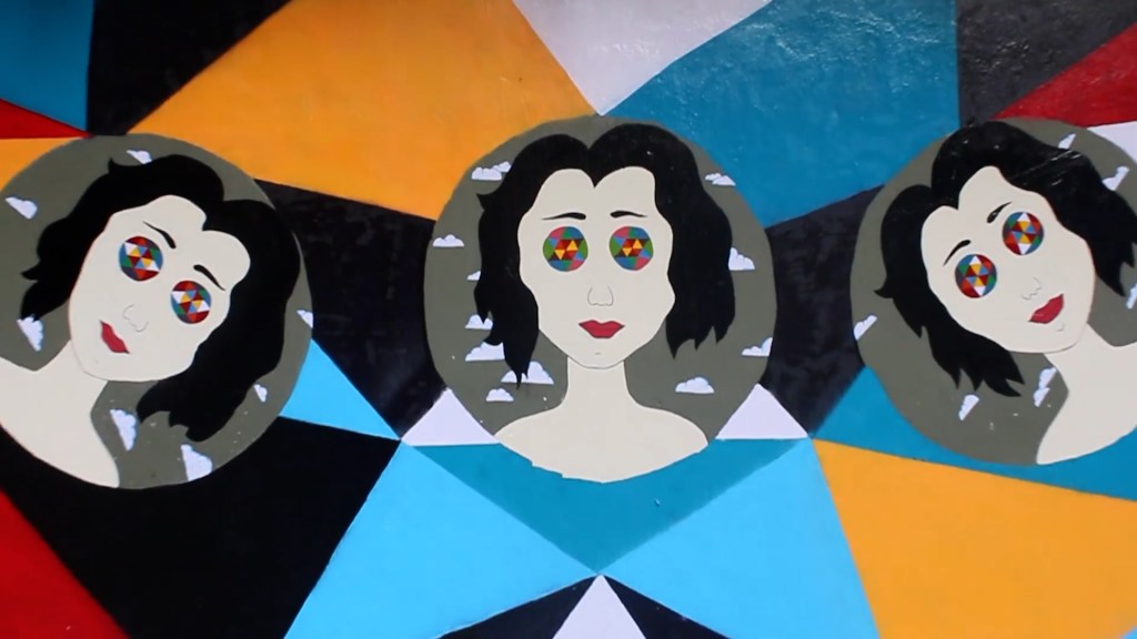 This wall mural is based on the line ‘a girl with kaleidoscope eyes’ from ‘Lucy in the Sky with Diamonds’, a song by The Beatles.